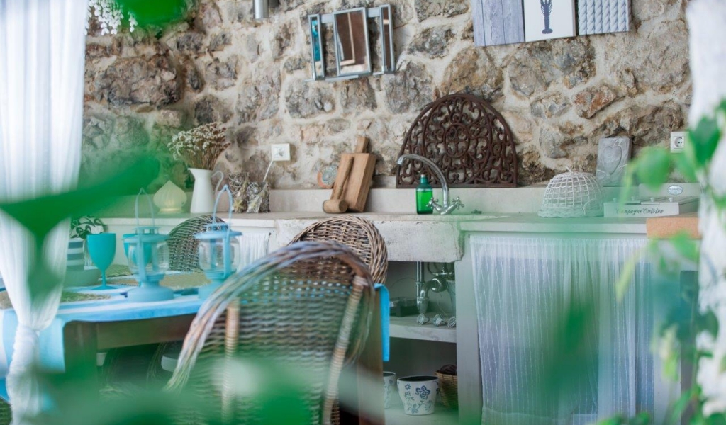 100M2 secluded private courtyard with palms, herb garden and a lemon tree. There is an outdoor kitchen area and shower. Here can you enjoy your evenings dining al fresco under subtle lighting with meals prepared on the traditional grill. There is an external old stone stairway leading up to the first floorLiving/dining area: