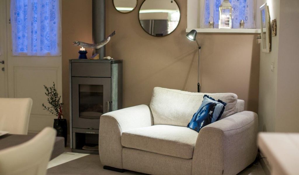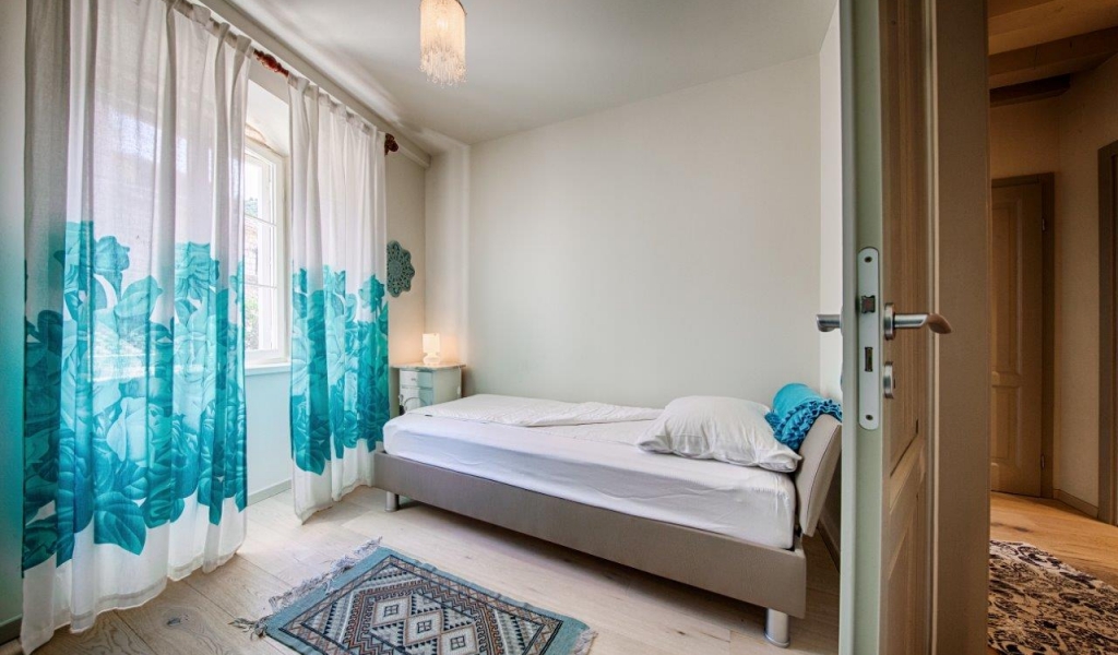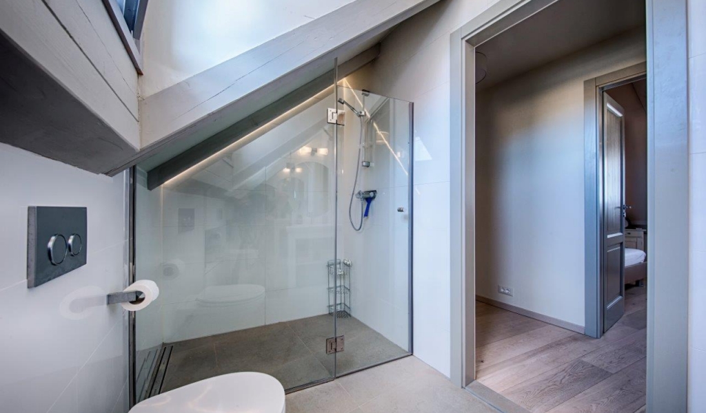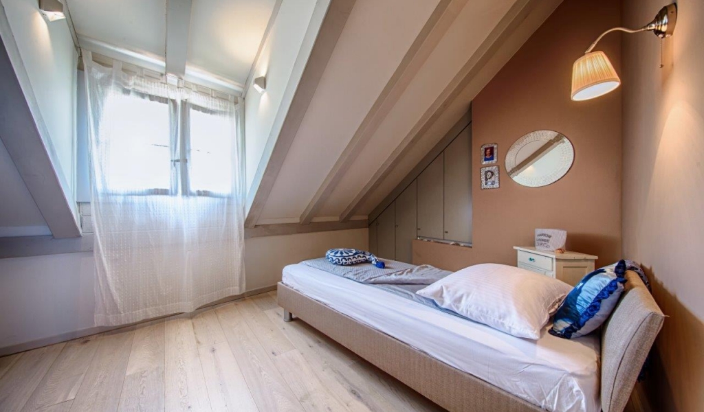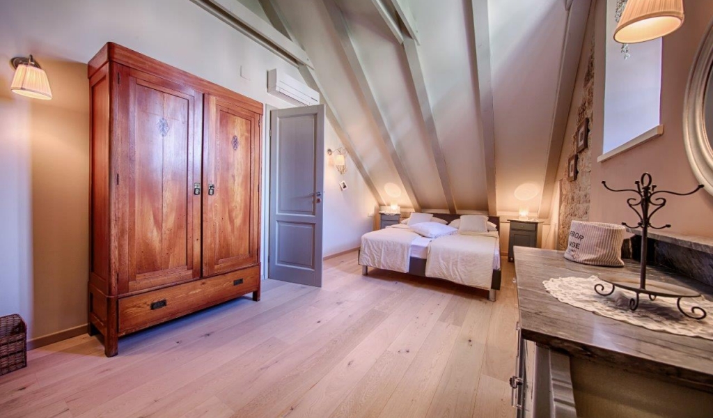 From the stone stairs you come to a spacious hallway with a glass wall which lets in the light from the living room. There are 2 double bedrooms, 1 single bedroom and a large spacious bathroom on this floor. All rooms are tastefully decorated with new and old furniture and there is air condition throughout. Floor heating is in the tiled bathroom. An oak stairway leads you up to the attic.Attic:
